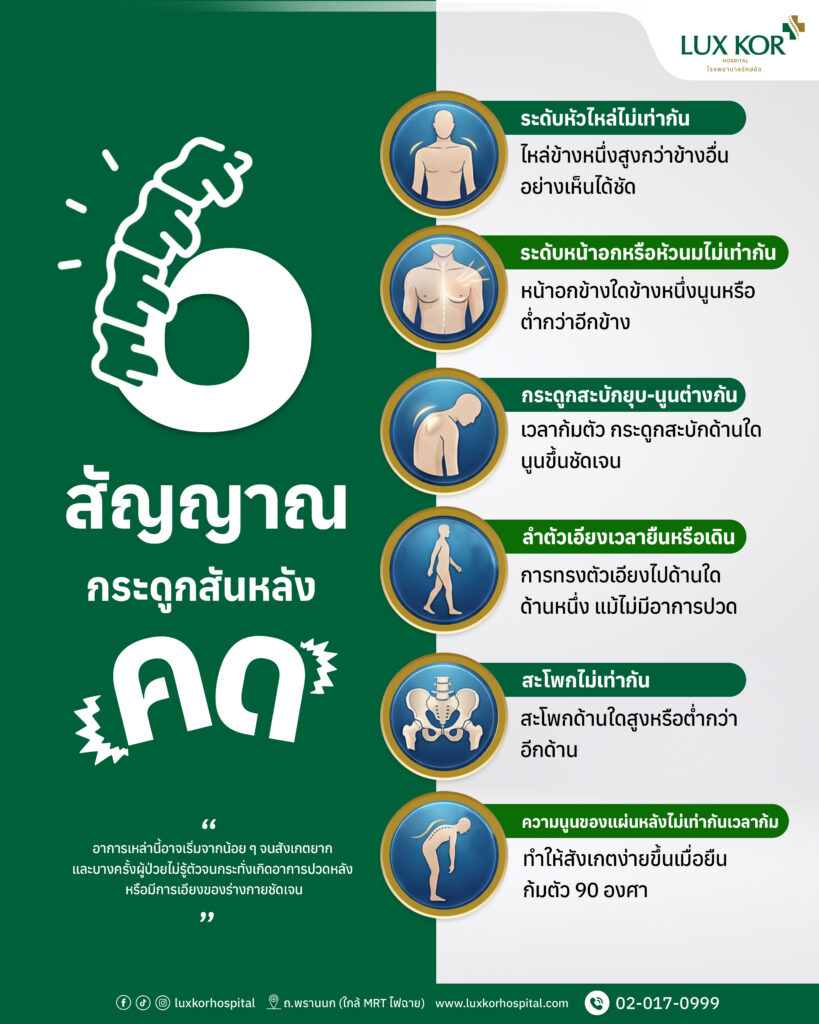 หากคุณสงสัยว่ามี อาการกระดูกสันหลังคด หรือมีอาการปวดหลังเรื้อรัง แนะนำ เข้ารับการตรวจและปรึกษาแพทย์ที่โรงพยาบาลรักษ์ข้อ โรงพยาบาลเฉพาะทางด้านกระดูกและข้อ 📞โทร. 02-123-4567 หรือ LINE: @luxkorhospital เพื่อรับคำปรึกษาและนัดหมายตรวจ