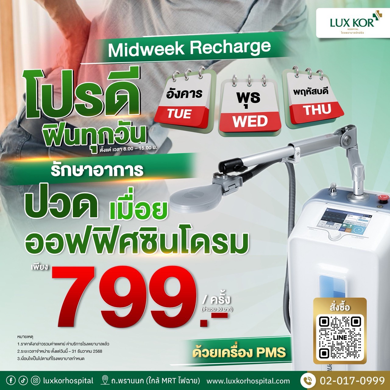 โรงพยาบาลรักษ์ข้อจึงจัดโปรแกรม ‘Midweek Recharge – คลายกล้ามเนื้อด้วยเครื่อง PMS’ เพื่อช่วยฟื้นฟูความสมดุลของร่างกายให้กลับมาสดชื่น พร้อมลุยงานต่อได้โดยไม่ปวดเมื่อย!
